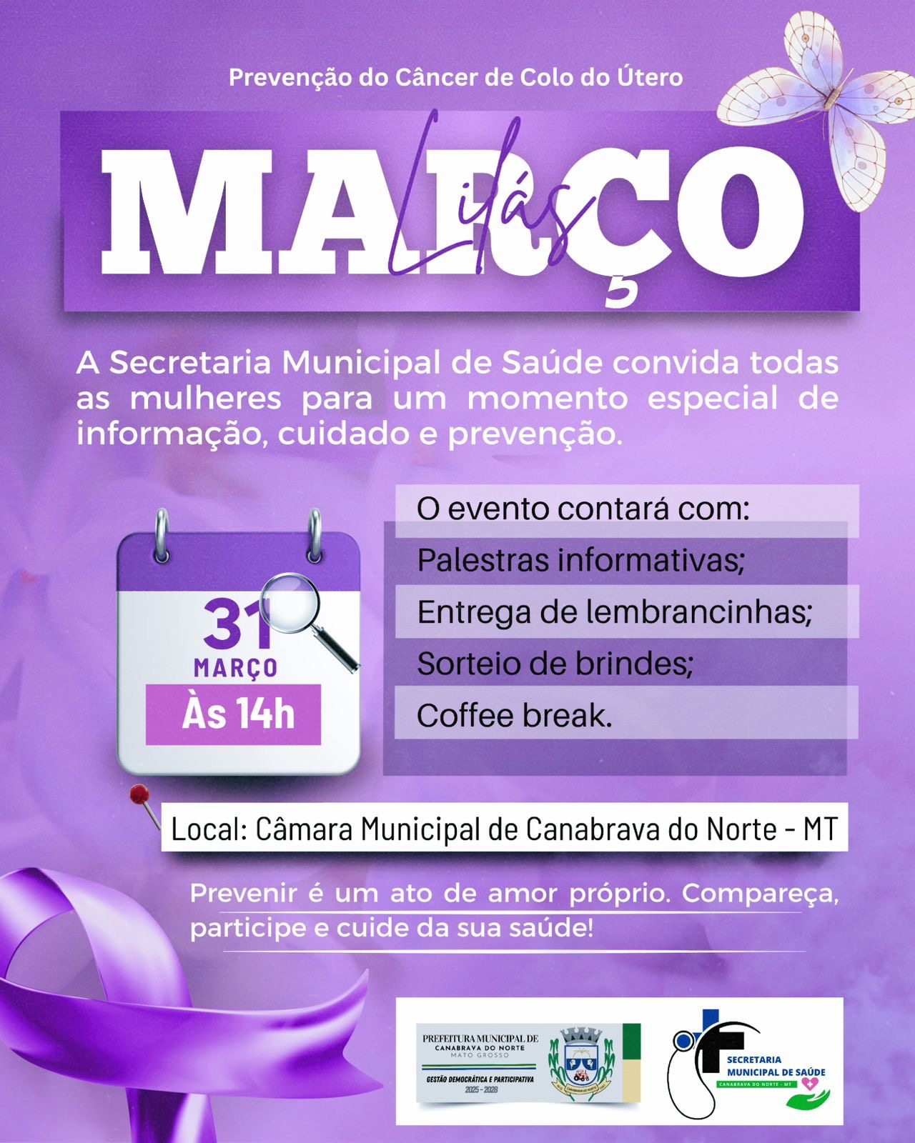 A Secretaria Municipal de Saúde convida para ação de prevenção ao câncer de colo do útero.