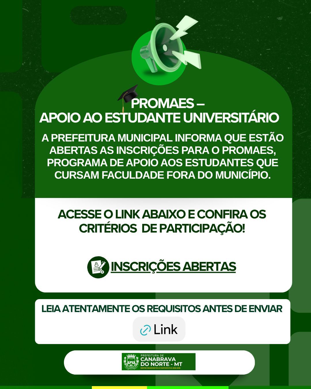 A Prefeitura Municipal de Canabrava do Norte informa que estão abertas as inscrições para o PROMAES, programa de apoio financeiro aos estudantes que cursam faculdade fora do município.